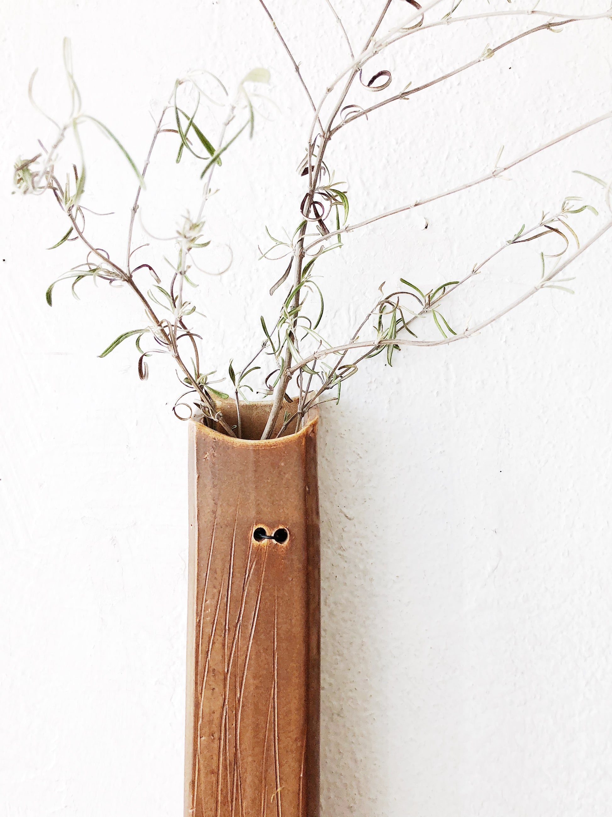 Beautiful thin and oblong ceramic wall vase. Has an integrated hook on the back for hanging. Lovely for a long wispy stems or even to pot up with trailing succulents
