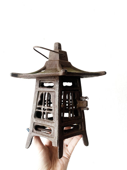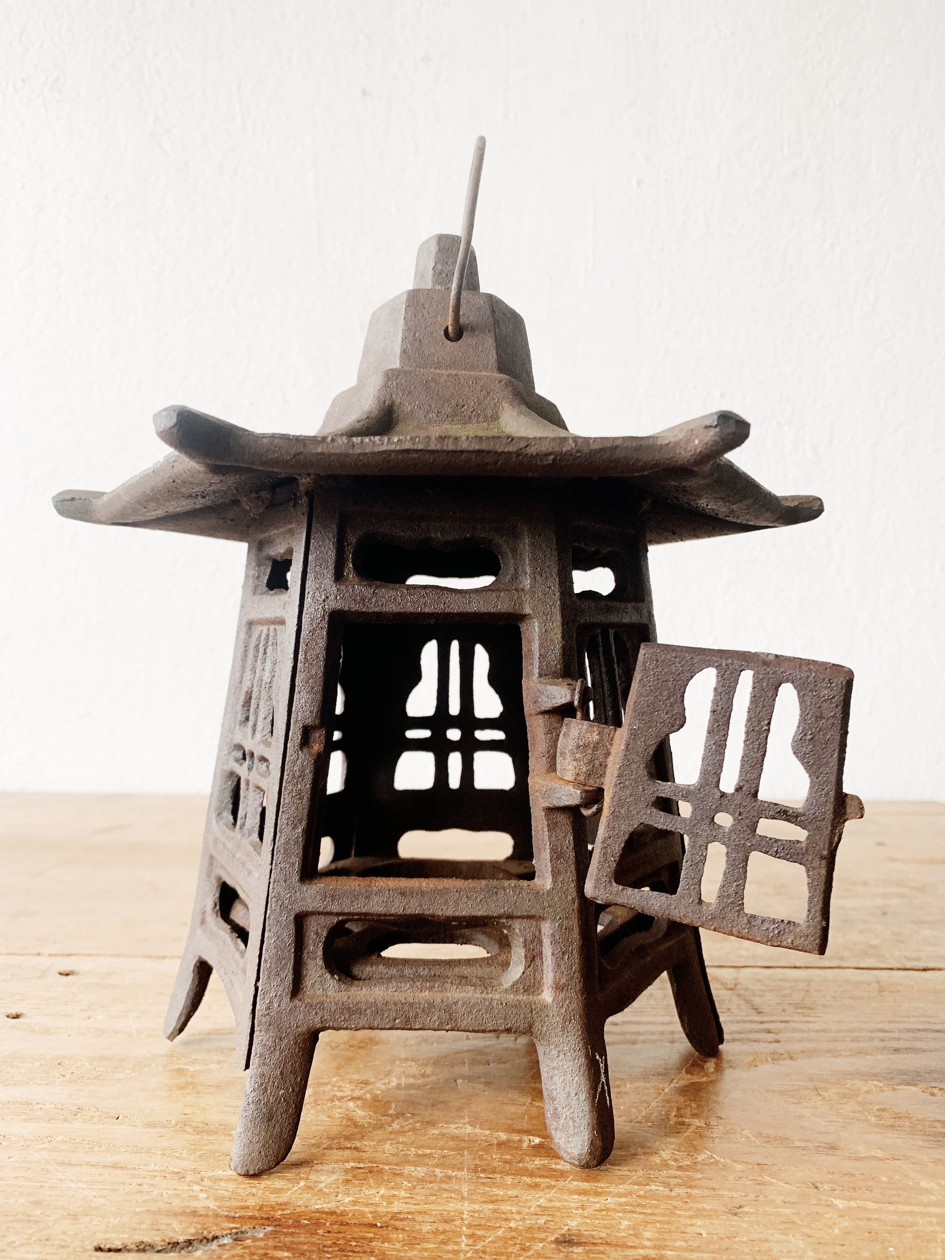 Weighty antique iron pagoda lantern. So wonderful! Aged patina