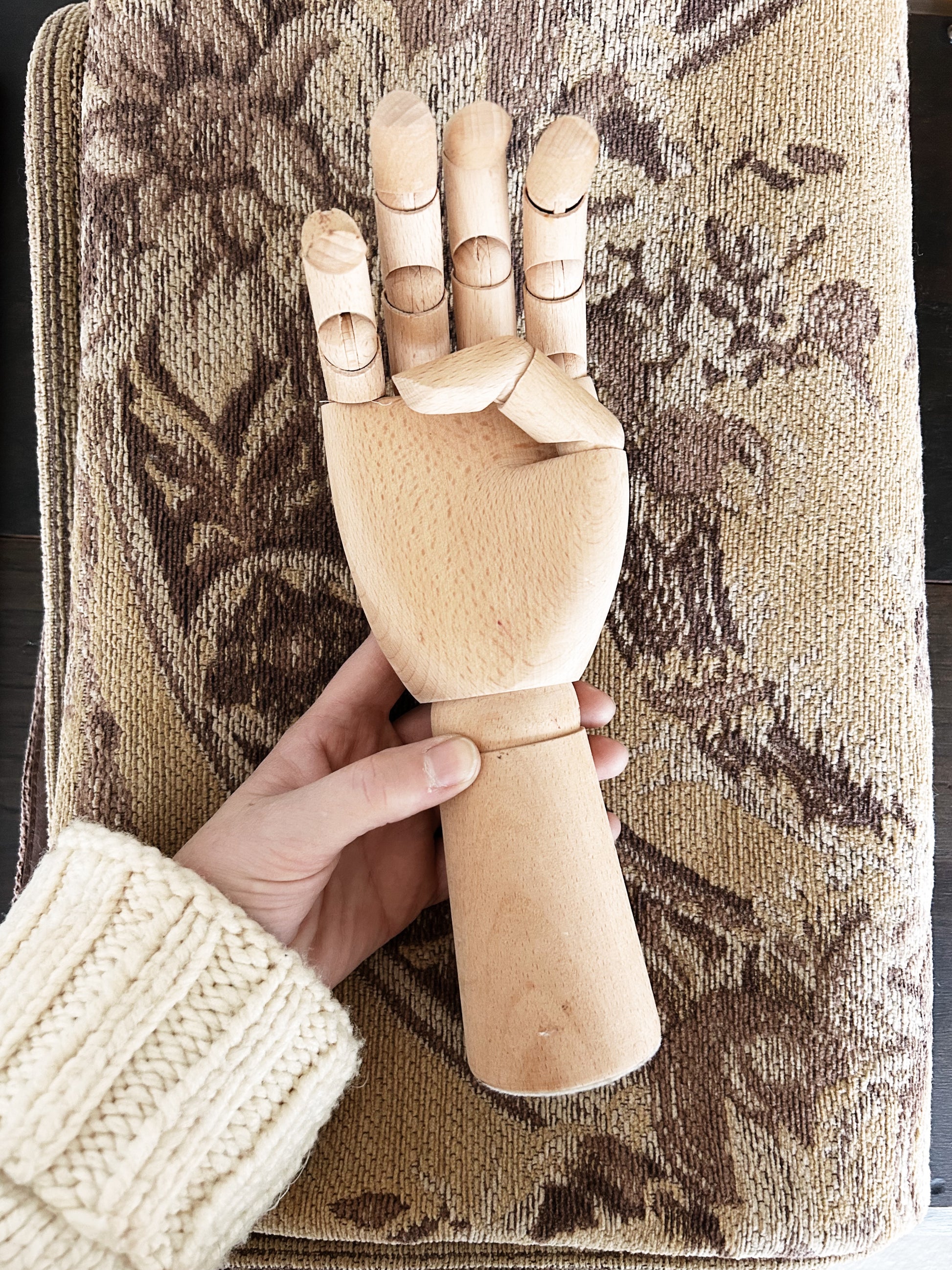 Wooden ball joint fingers and movable wrist. Great displayed amongst plants and books or use for holding ring and such!