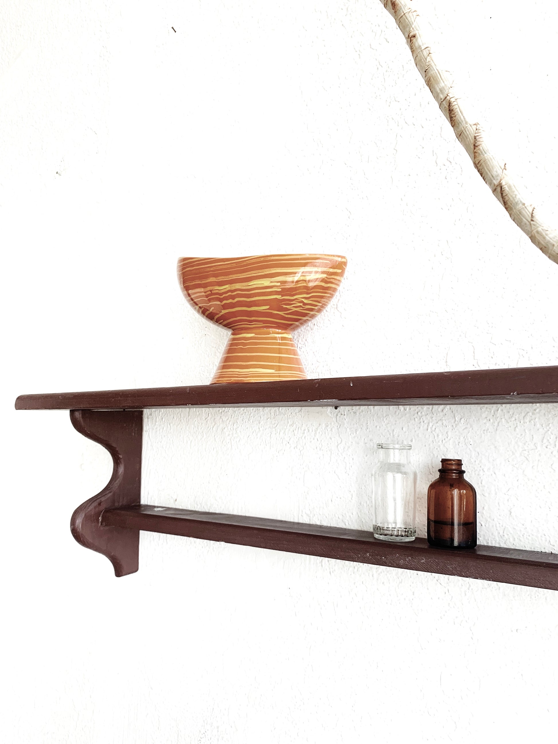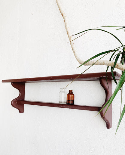 Vintage wood wall shelf painted a deep matte plum brown. Love the little bottom shelf, it’s perfect for essential oils, small apothecary jars or spice jars.