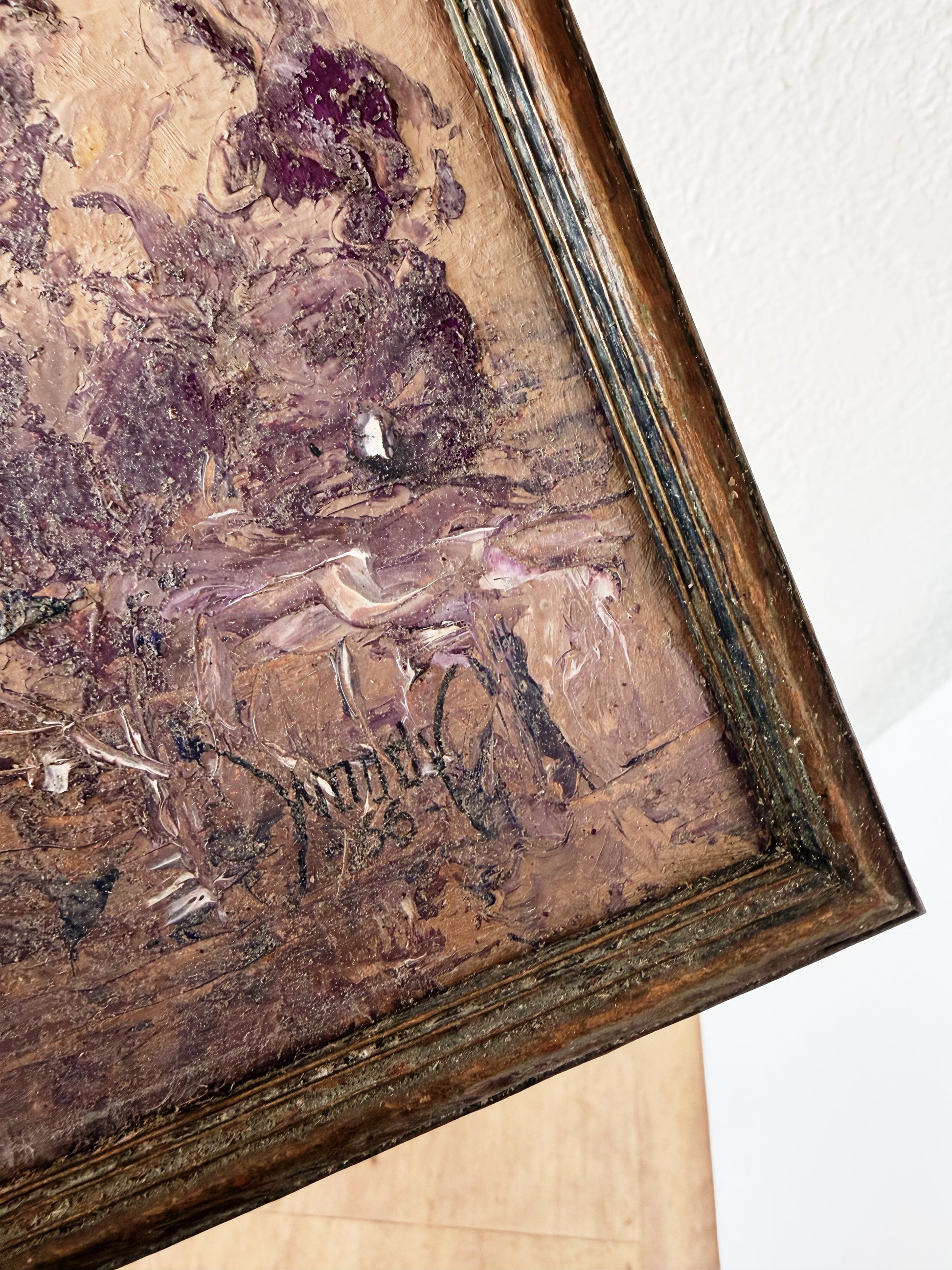 1950s Woody Tallman landscape painting, oil on board. The hits of lavender and deep plum are exceptionally soothing. It looks like Woody added some sand into the paint which gives it a nice texture. This painting has a wonderful ethereal quality to it. Presented in a antique wood frame. Signed in his excellent signature and dated 1956