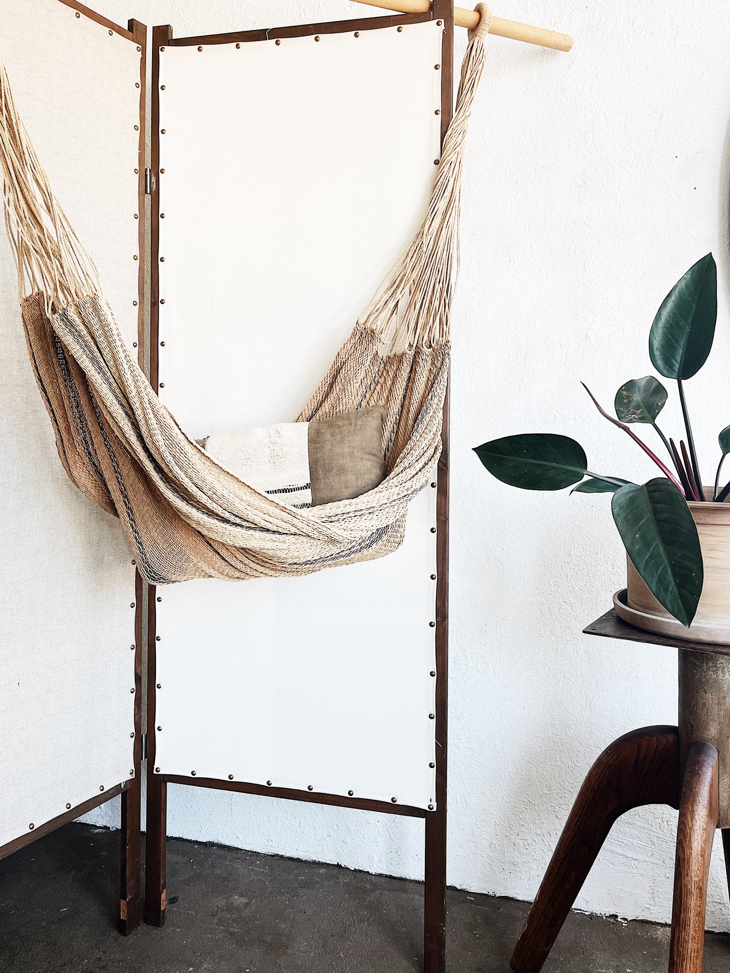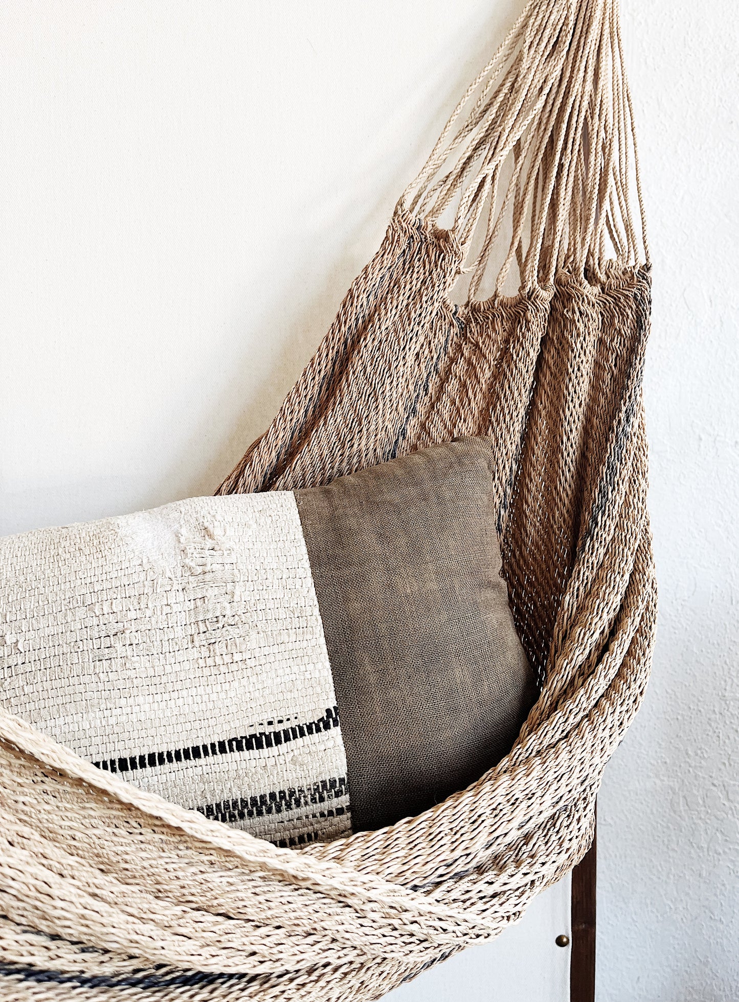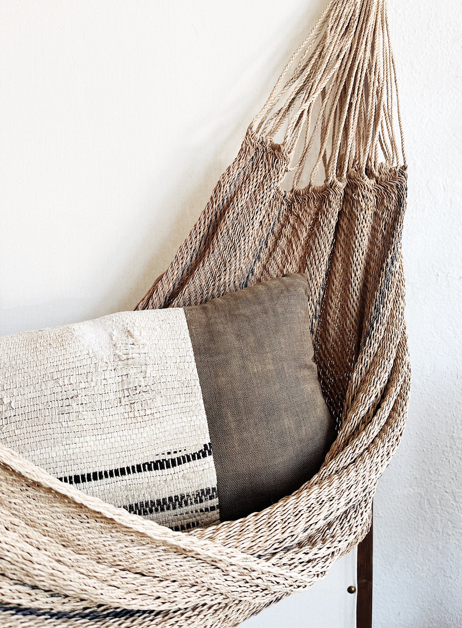 A hammock built for one. More like a loveseat / oversized chair. Woven, sturdy and soft. Comes with a kapok filled rag cotton pillow, heavily mended