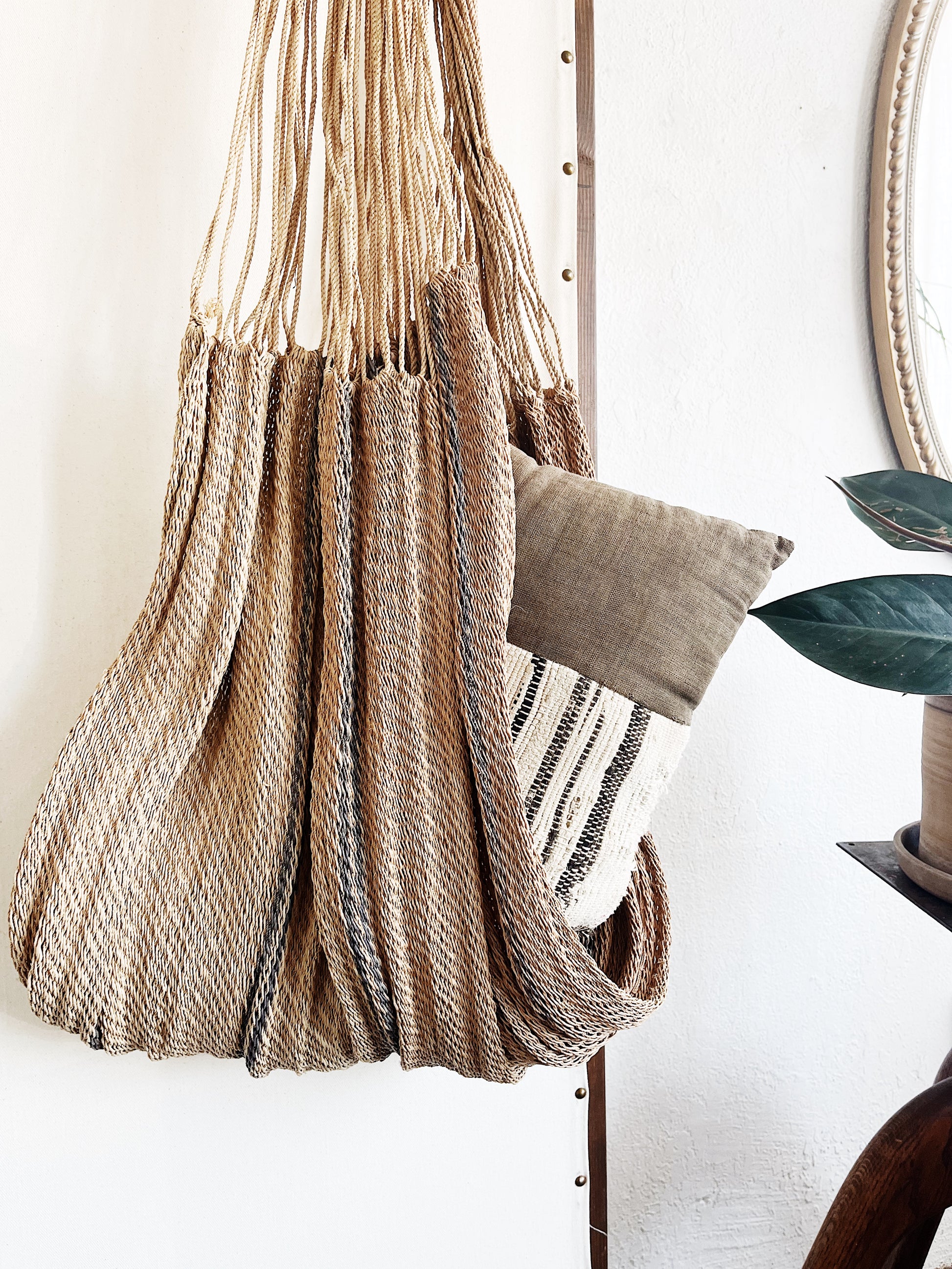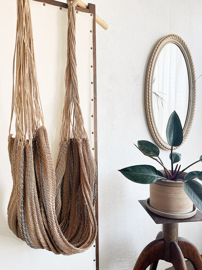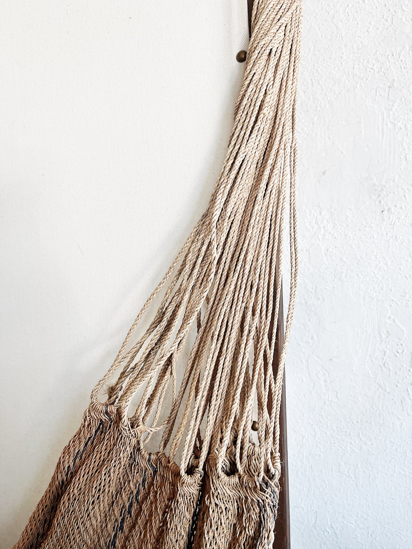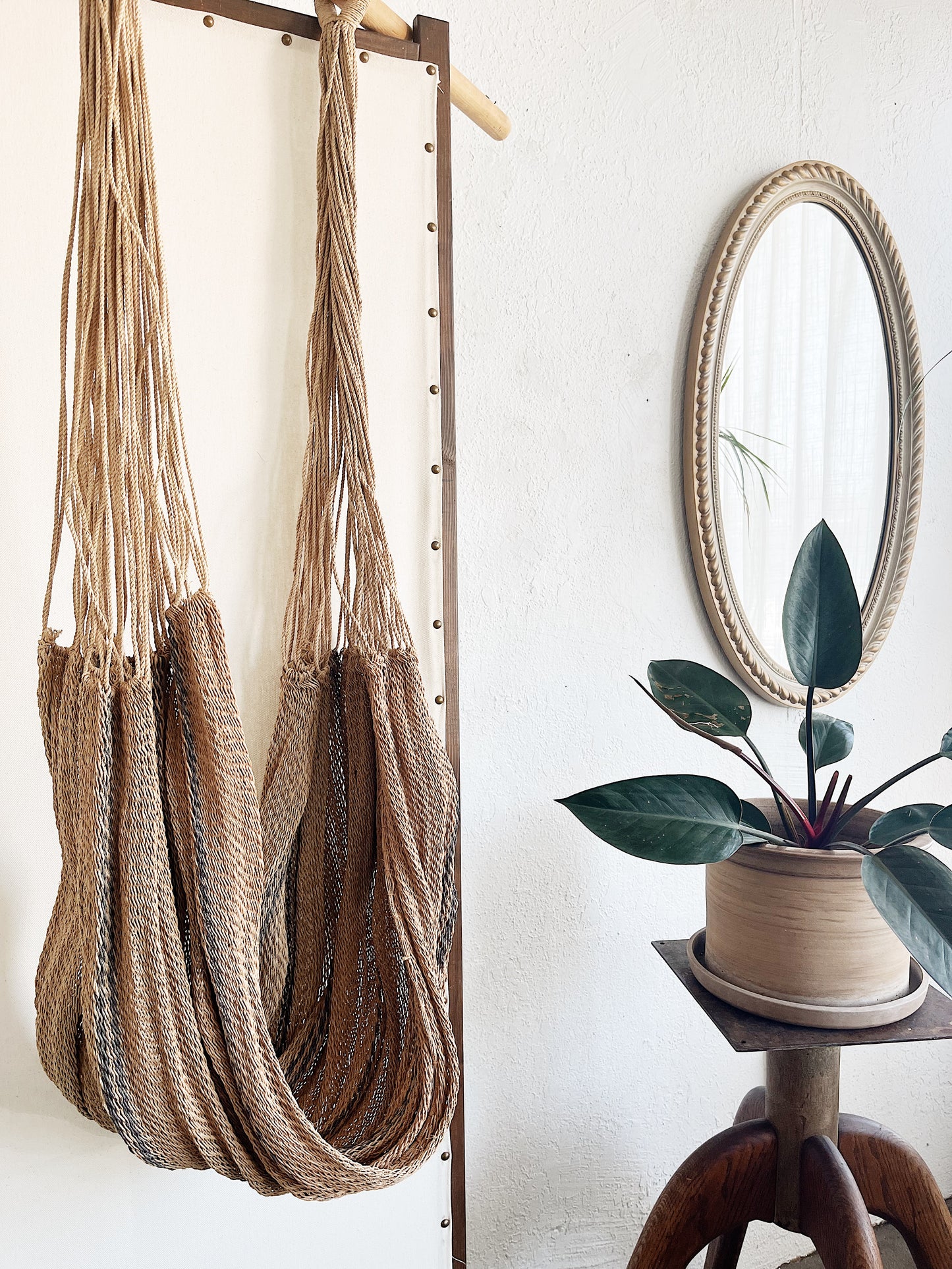 A hammock built for one. More like a loveseat / oversized chair. Woven, sturdy and soft. Comes with a kapok filled rag cotton pillow, heavily mended